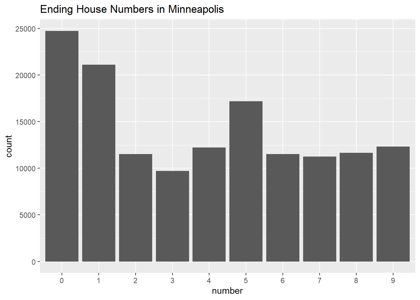 Address points are from Hennepin County GIS and are filtered to only have city = Minneapolis. Then we filtered to only include address numbers ending with a 3, which will be addressed below. Then again we removed duplicates by only keeping unique addresses. There were apartment buildings in the data set, so we only kept one address from those buildings.