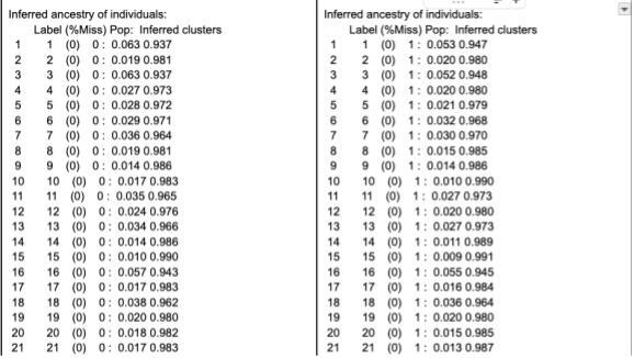 Now that we have a bit of a better idea of the equations STRUCTURE uses to sift through the genome we can start to understand how the model runs. The STRUCTURE software can be found here, and is free to download. Now the first necessary item to run structure is genetic data. There are a few issues I’ve run into regarding the data formatting, the first being that you need column titles for the chosen SNPs. Individual and population markers are also necessary, however the population markers don’t seem to have too many constraints. The table below shows the ancestral percentages for individuals when a population marker was given for two distinct populations and then again when the marker was set to 0. As is evident in the table, the inferred clusters are almost exactly the same across the two tables despite the given population being different.